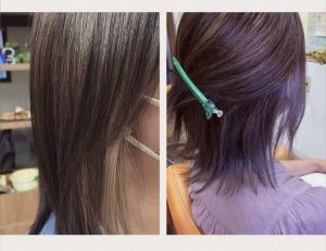 先日ブリーチをした後色を入れさせて頂きました。ベージュとパープルのお色です!!