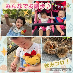 この日同じ時間に遊びに来てくれたみんなでお散歩に出かけ、柿や栗が実をつけているのを見つけたり、どんぐりや木の実もたくさん拾いました😊